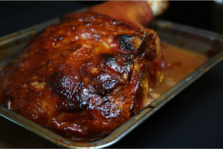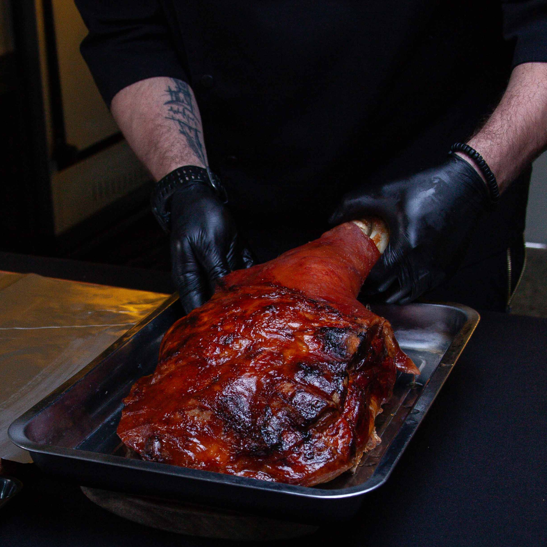 - Lo laqueamos con una mezcla de mostaza, cerveza negra y miel, logrando un aroma y presentación de calidad.